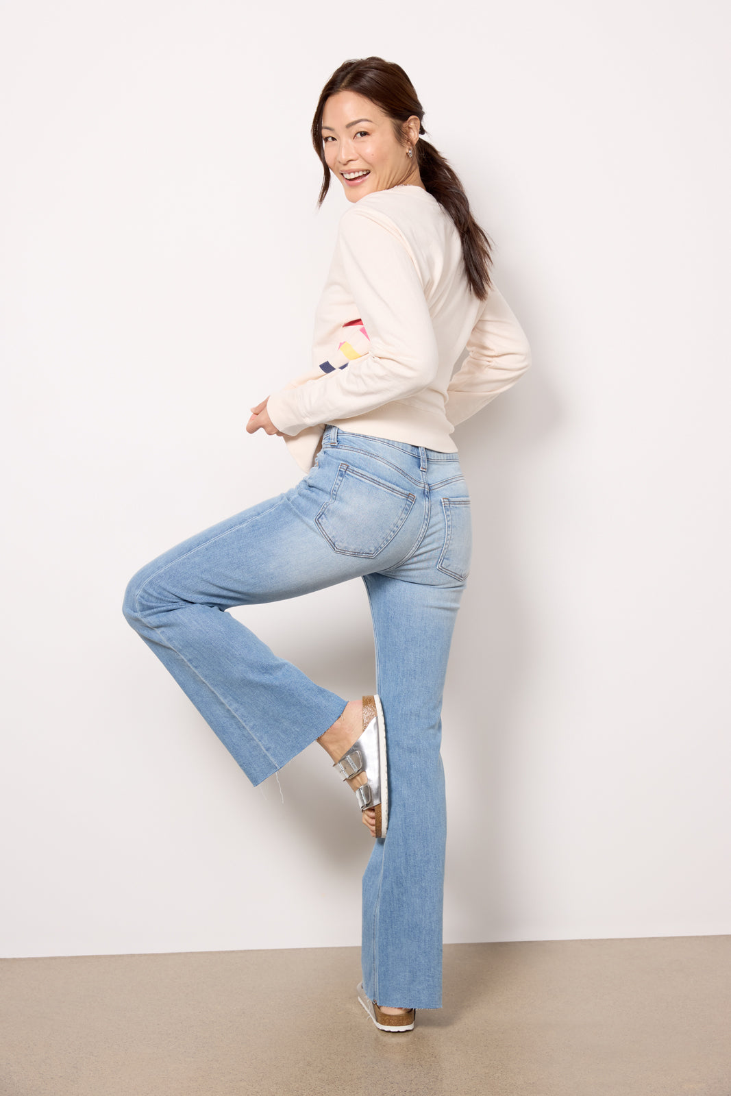 A flattering flared leg defines the Stella jean by Kut From The Kloth. crafted in comfort-stretch denim with a mid-rise fit. zipper fly closure. and raw hems. The versatile blue wash will take you from day to night. while the full-length inseam creates a legs-for-days look.