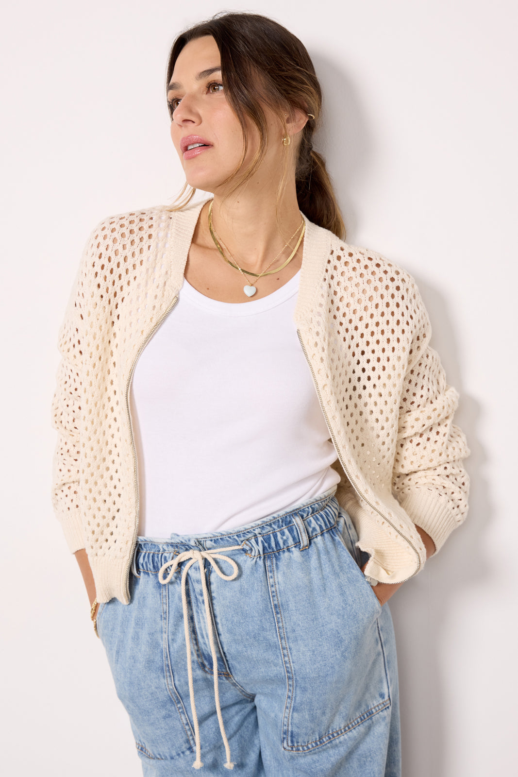 The Stepping Out Bomber by Sanctuary is the perfect warm-weather layer. crafted in open-knit cotton with a front zipper closure. round collar. and ribbed trim. You’ll love it paired with your favorite tees and tanks all season long.
