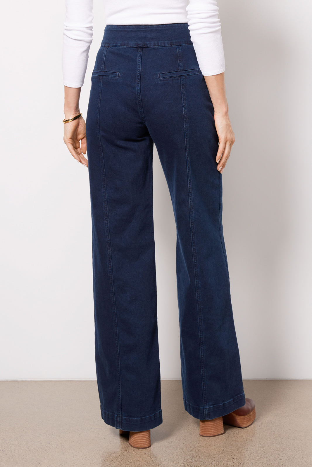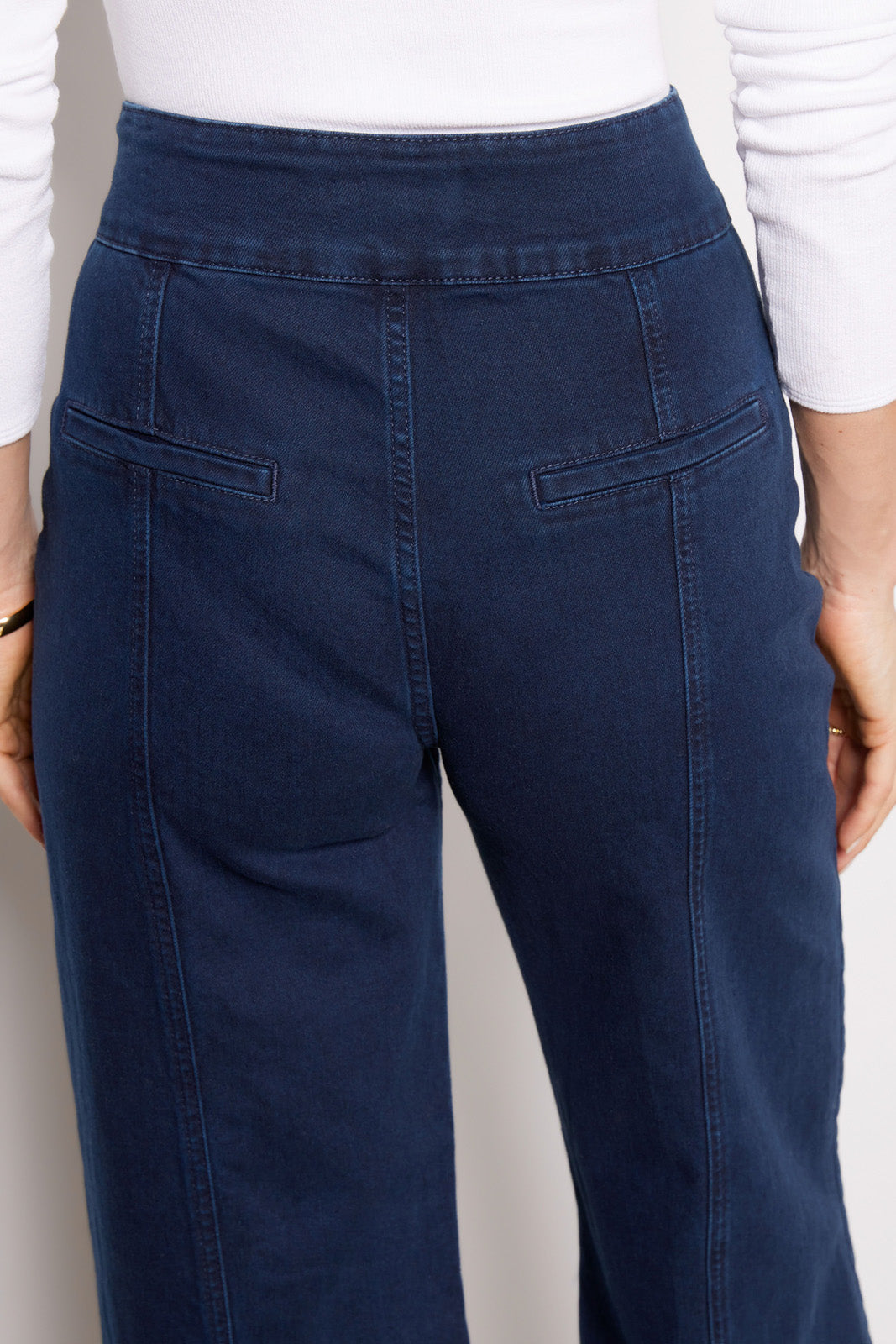 Seam details and welt pockets give a perfectly tailored look to these wide leg jeans by FRAME. Ideal for work or weekend. these polished jeans are finished in a deep blue wash with a high-rise fit. full-length leg. and double button closure.