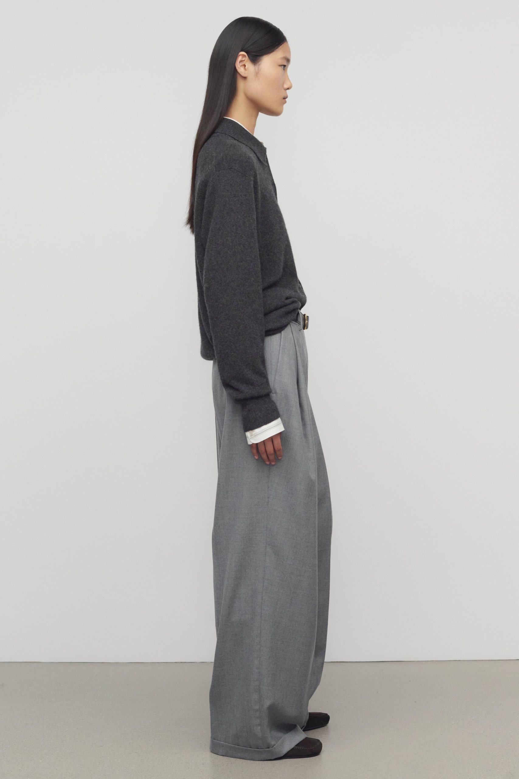 High-rise tailored trouser in virgin wool flannel with wide leg. front double pleats. and slanted side pockets.