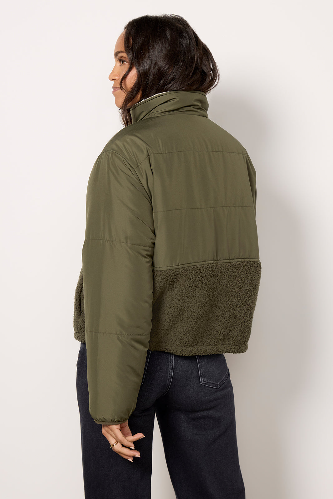 With two ways to wear it. this reversible sherpa jacket by Velvet will be your new favorite layer. The Tasha jacket features a stand collar. quilted paneling. and an adjustable bungee toggle hem for a customized fit.