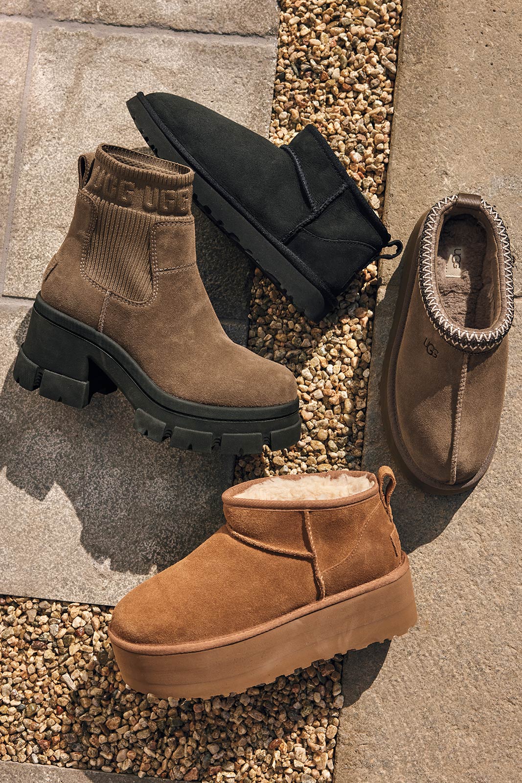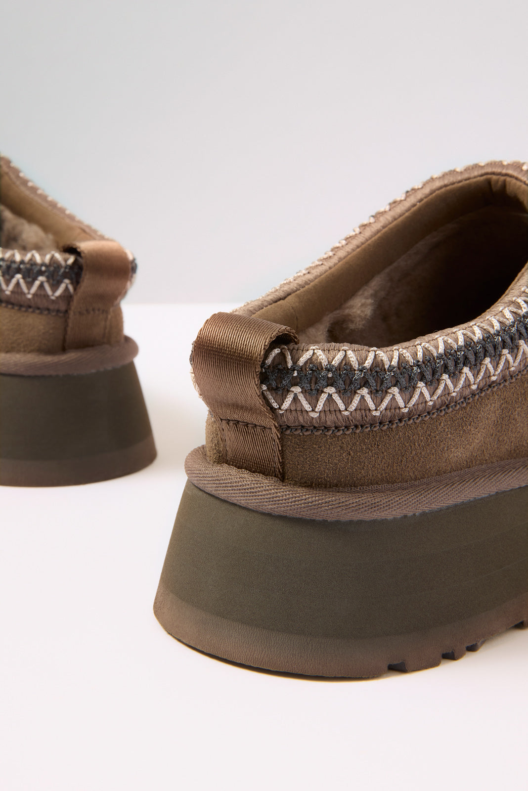 The UGG? Tazz platform slipper is crafted in a suede fabric with an EVA outsole and cozy UGGplush? lining. a moisture-wicking textile made from a wool-rich blend but made to feel and wear like shearling.