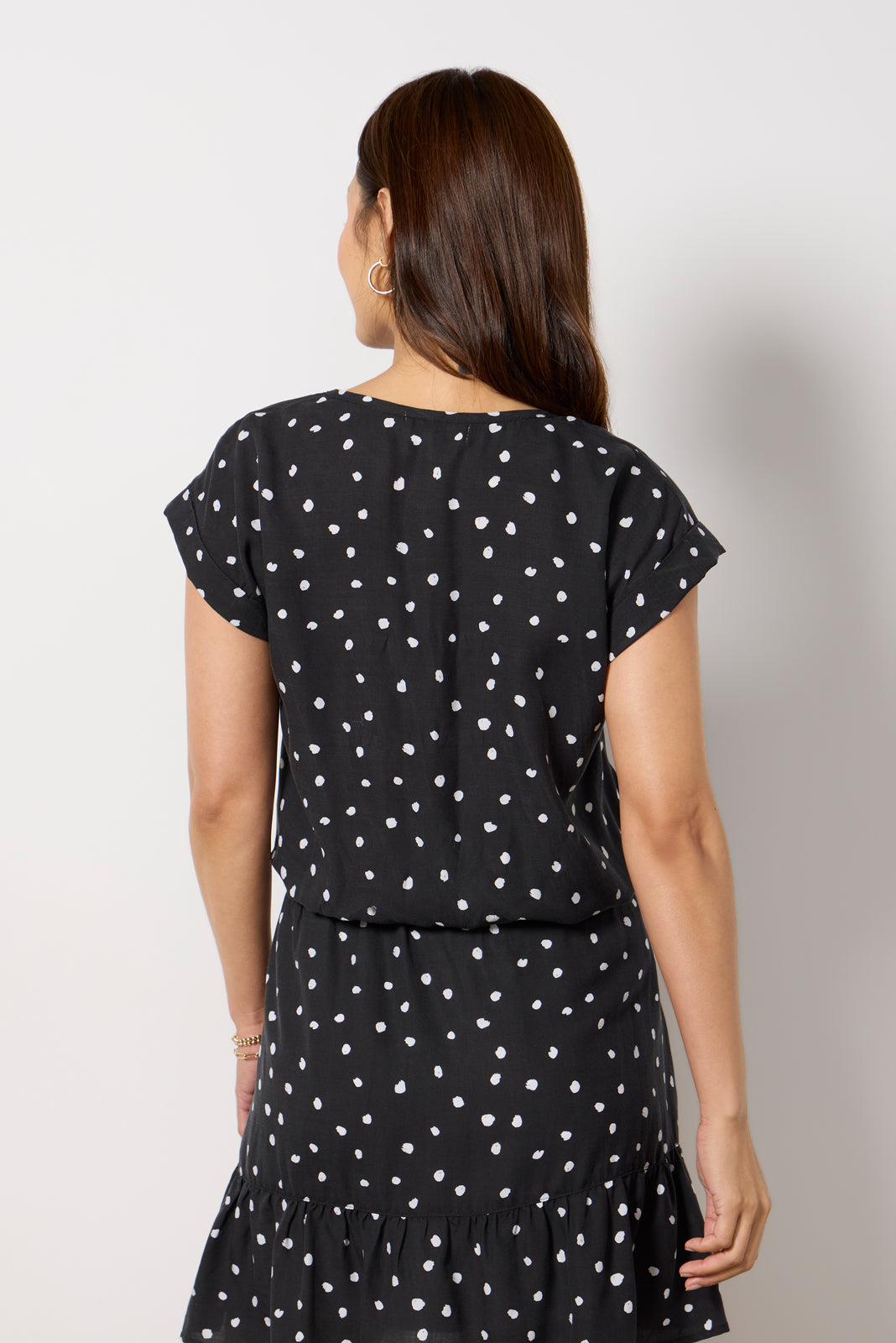 Finished in polka dots. the Textured V Neck Top by Cloth & Stone features a v-neckline. rolled short sleeves. and a relaxed silhouette. Make it a set by pairing it with the?Matty Tiered Skirt.?