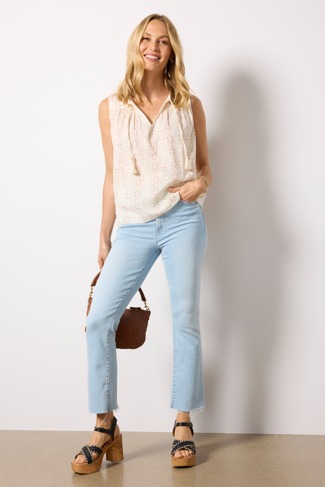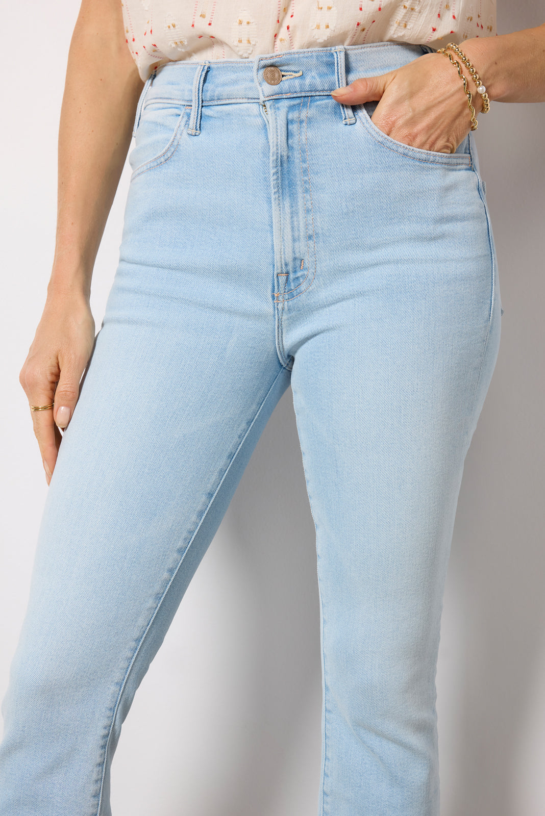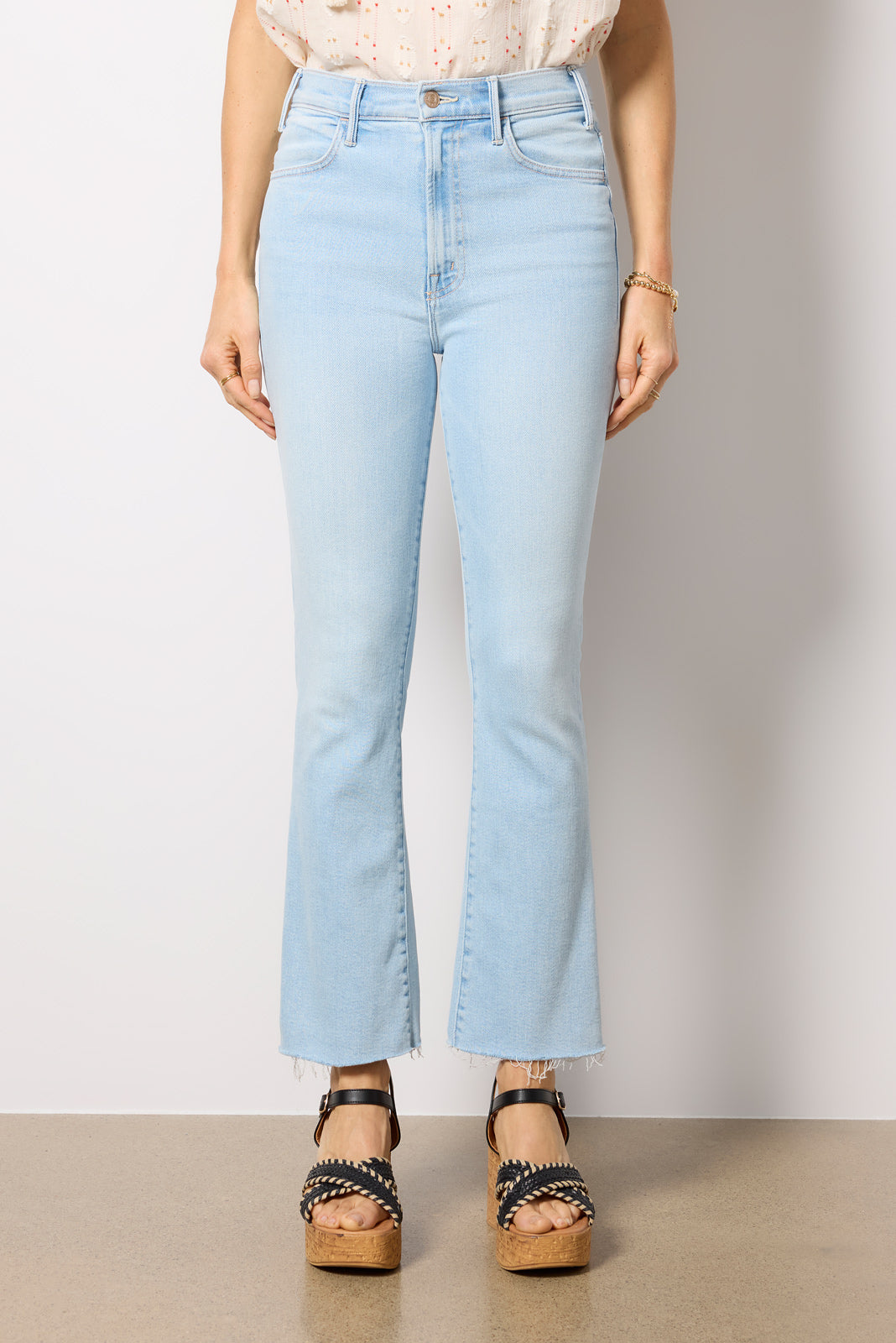 A?light blue wash and subtly flared?leg define The Hustler Ankle Fray jean by MOTHER. featuring a high-rise fit. raw hems. and soft stretch denim fabric.