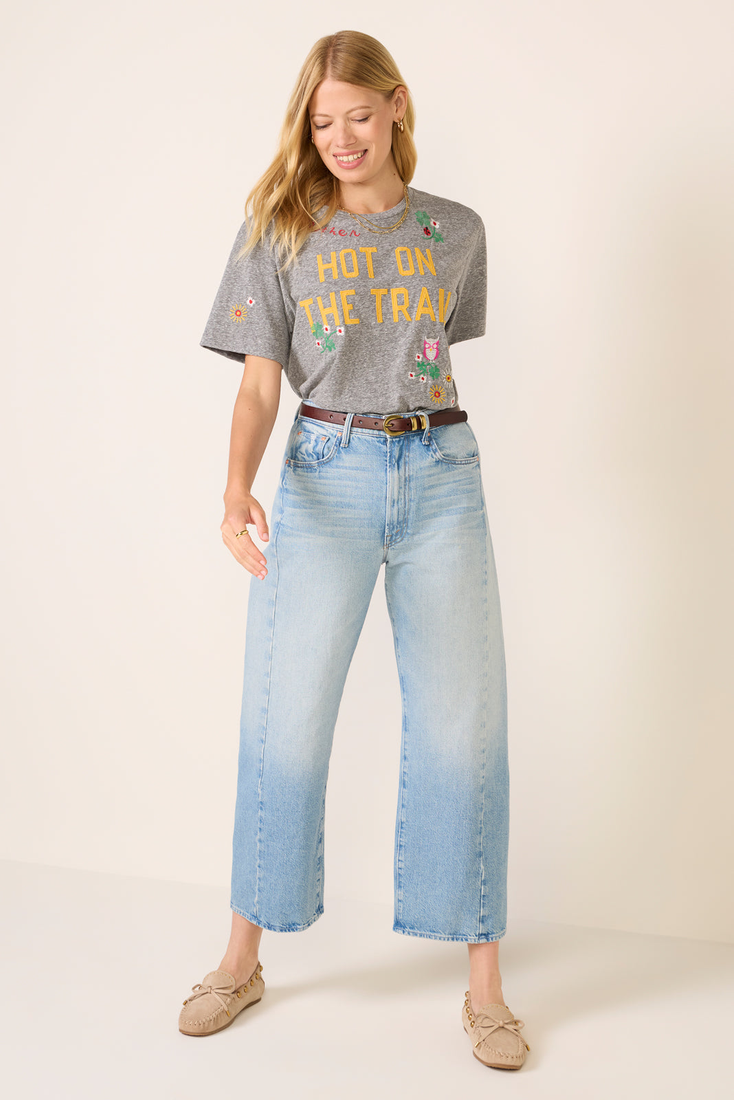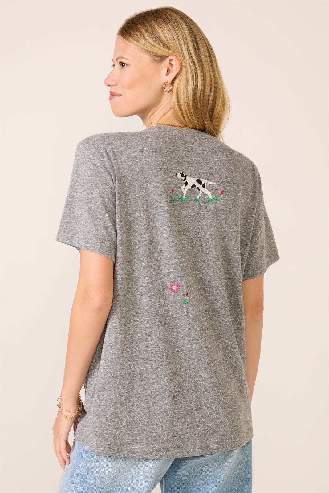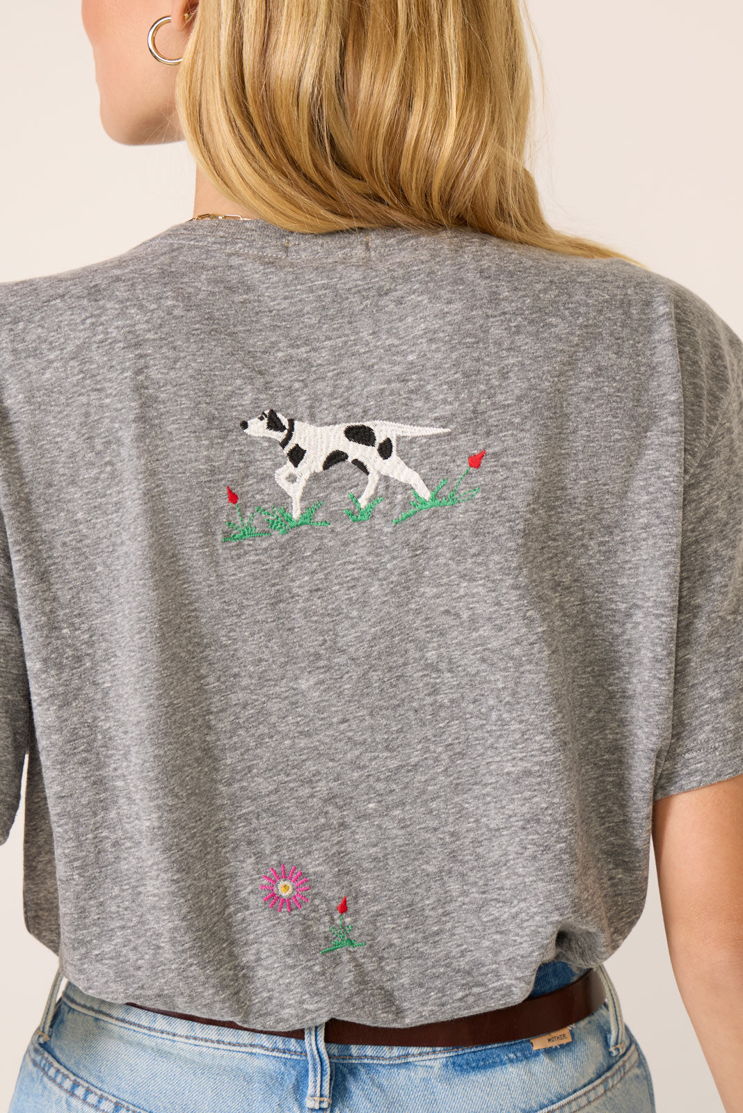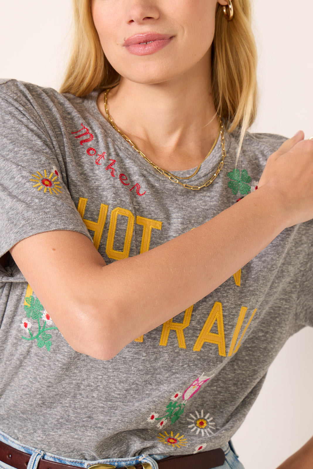 Top off your weekend wardrobe with this fun graphic tee by MOTHER. finished in soft heathered fabric with a relaxed fit. short sleeves. and colorful embroidery on the front and back.