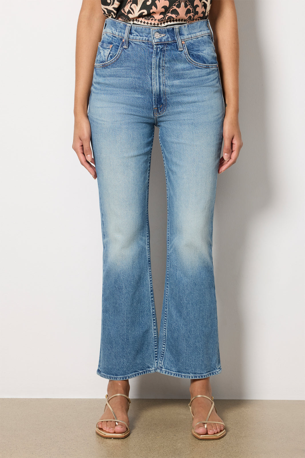 A relaxed fit and gently flared leg define the versatile Scooter Ankle jean by MOTHER. finished in semi-rigid denim with a high-rise waist and faded blue wash.