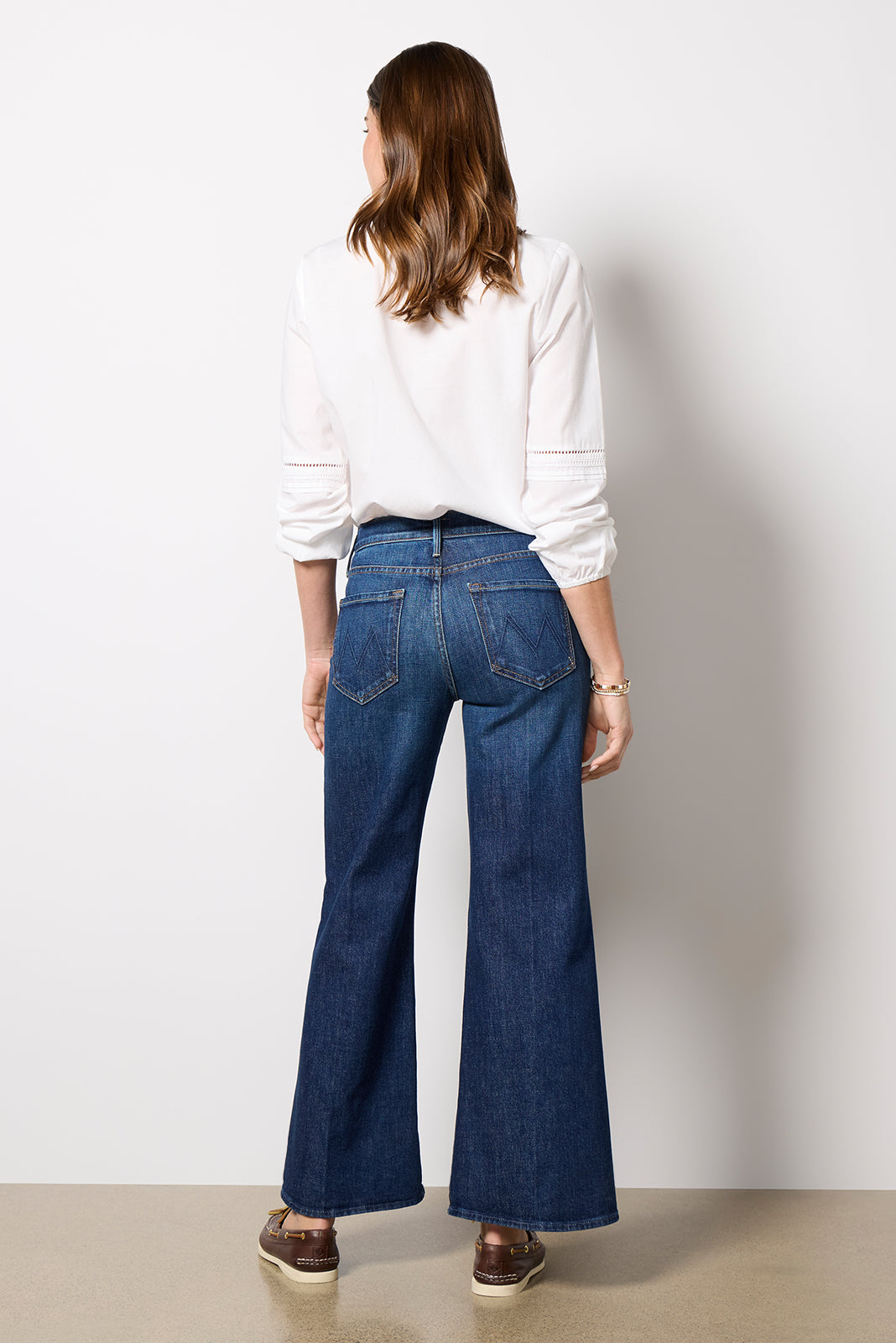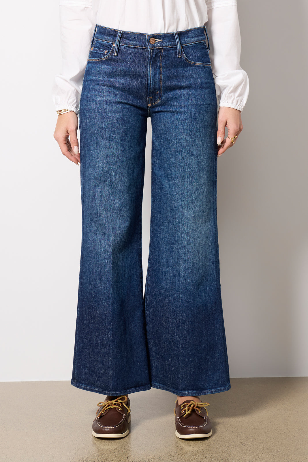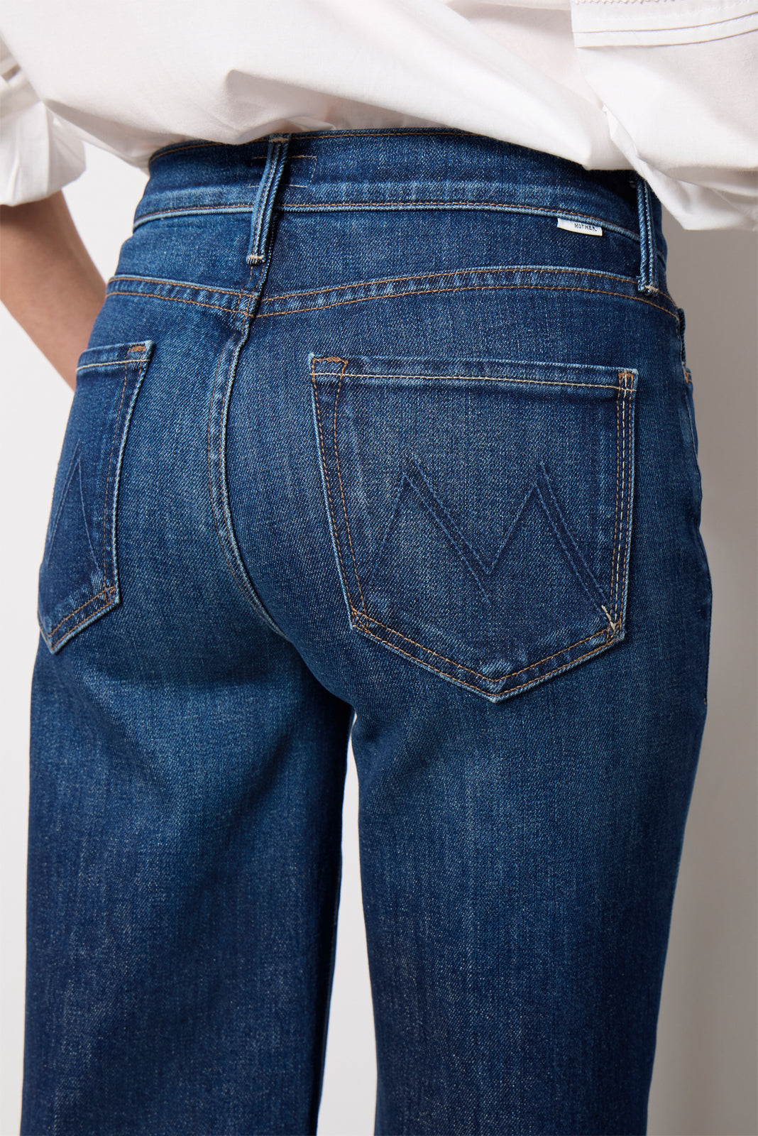 A flared wide leg defines the stylish Twister Flood jean by MOTHER. featuring an ankle-length inseam. clean hems. and dark-wash denim with fading at the knee.