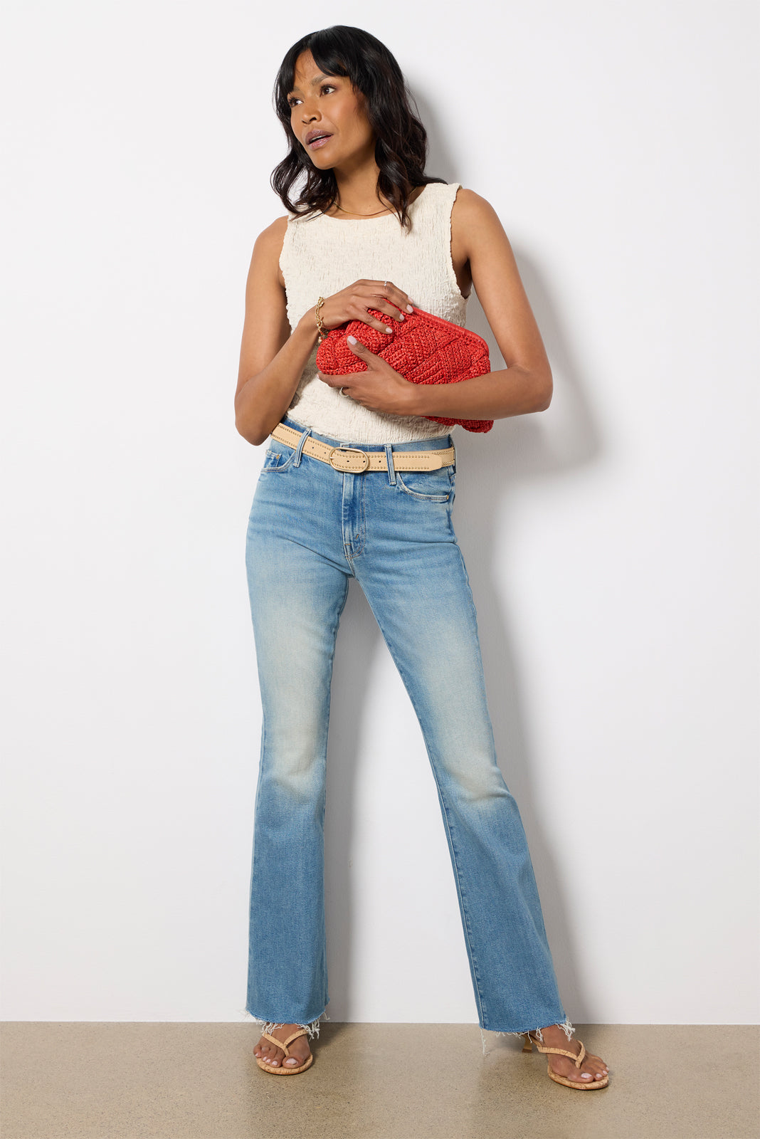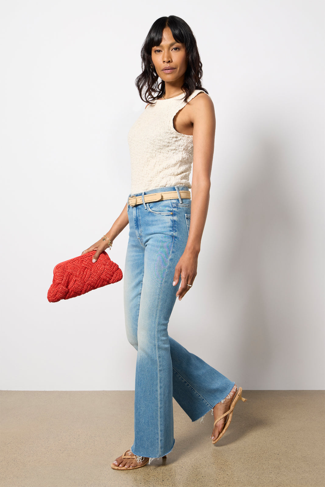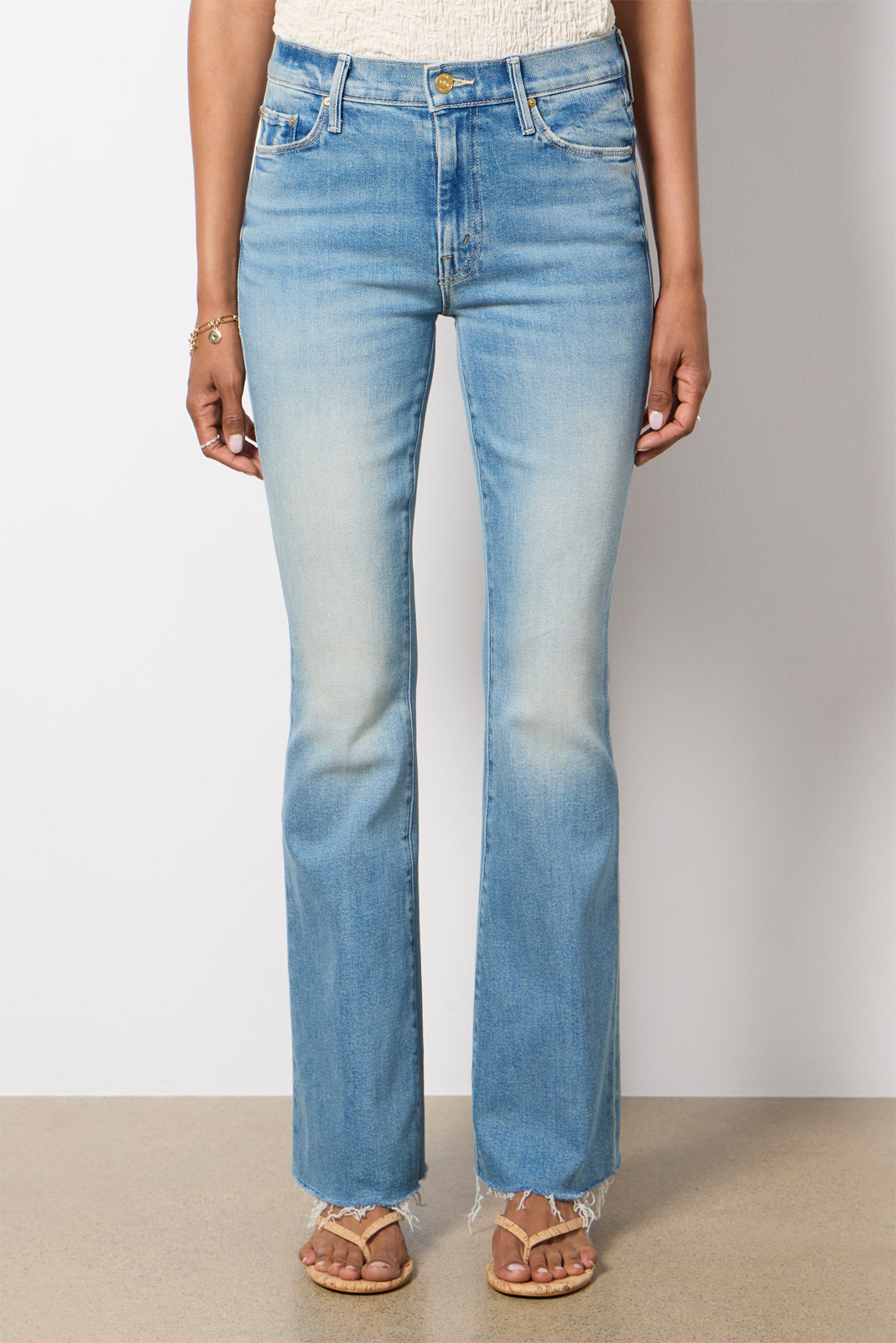 Finished with full-length raw hems. the Weekender Fray flare jean by MOTHER is crafted in soft stretch denim with a flattering mid-rise waist and faded light blue wash.