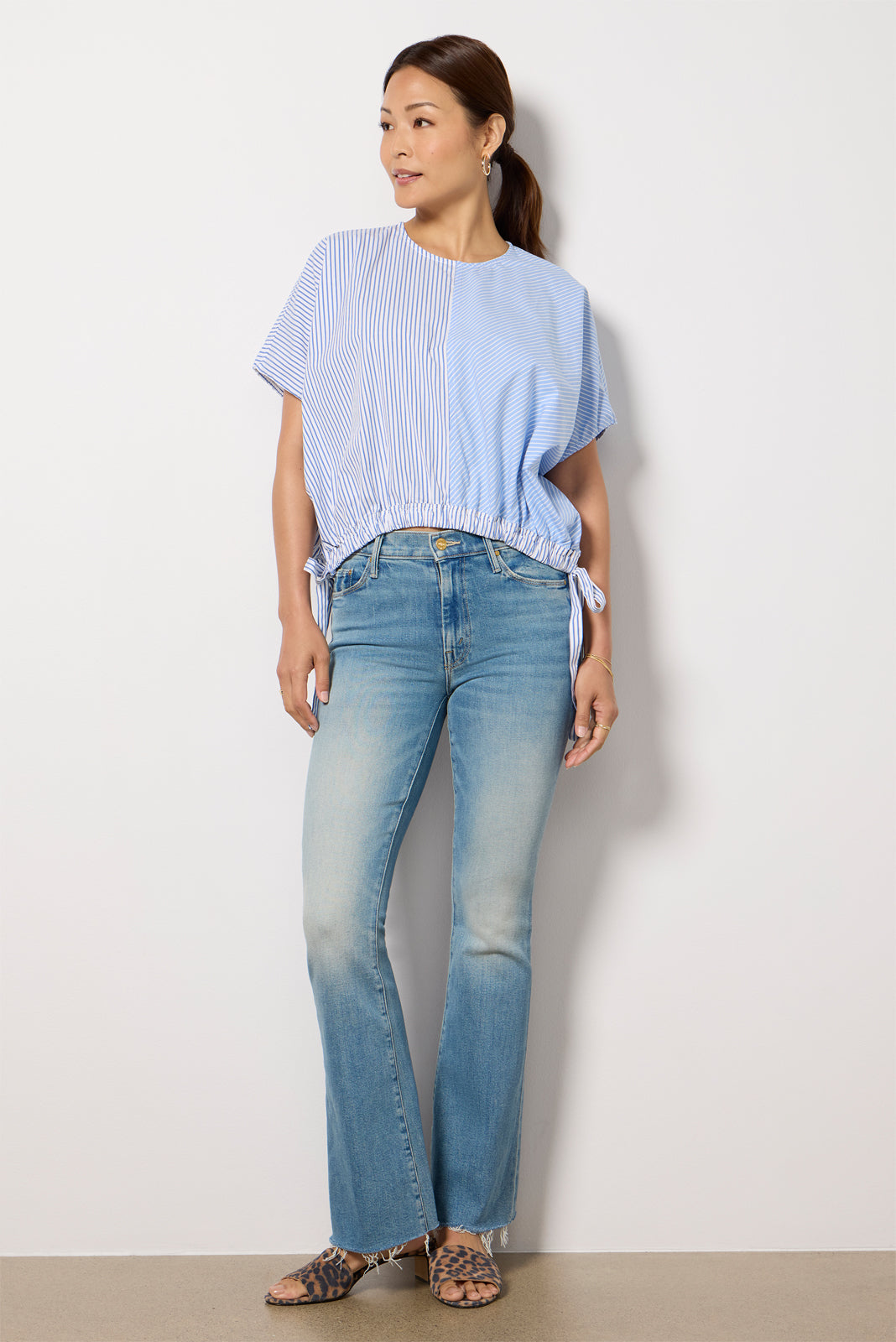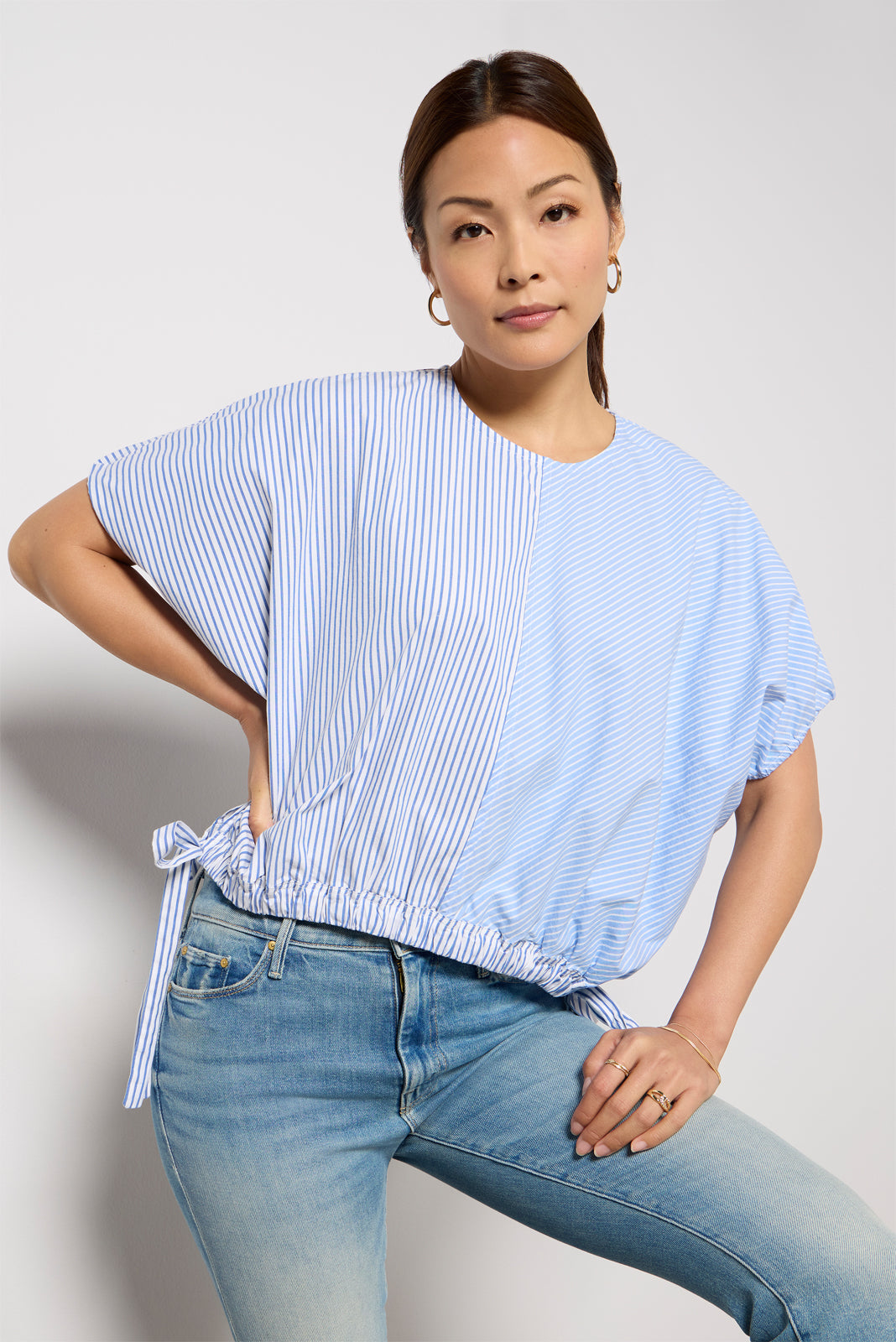 Contrasting stripes define the Vela Muscle Top by EVEREVE. featuring a crew neckline. relaxed silhouette. and an adjustable drawstring hemline with side tie details.