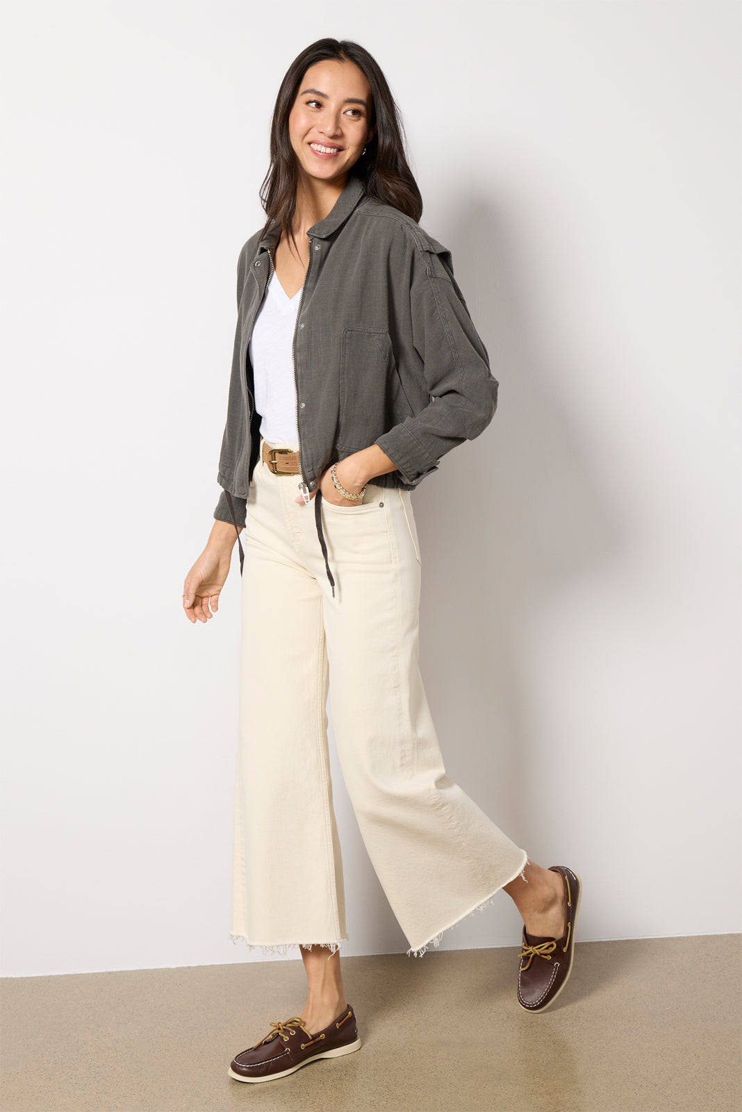 Utility details define this effortlessly cool linen jacket by BlankNYC. featuring a front zipper closure with snaps. an adjustable drawstring hemline. and patch pockets.?