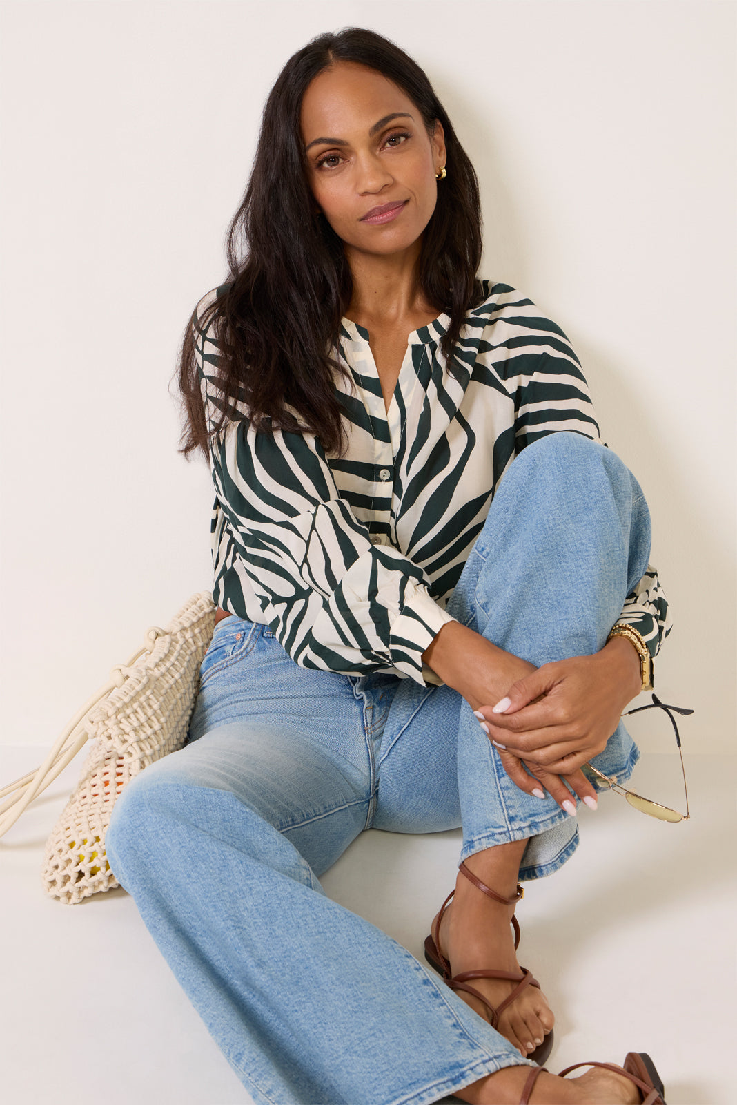 A palm print design defines the Without A Doubt Blouse by Sanctuary. featuring a split neckline. front button closures. long blouson sleeves. and a draped silhouette.?